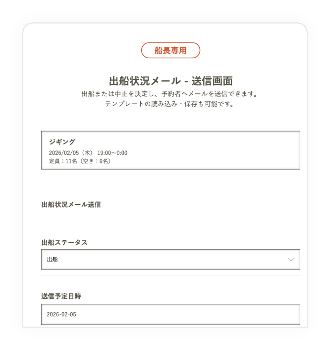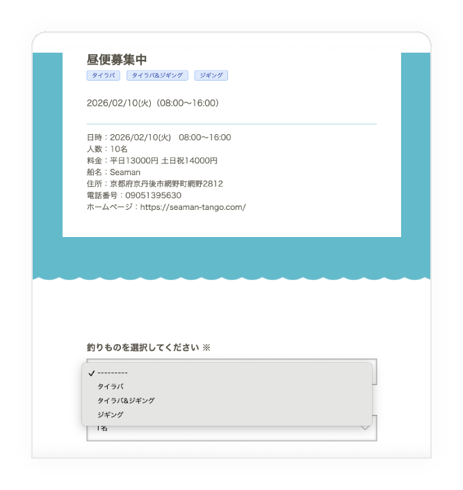 操作がとてもシンプルで、ネットが苦手な私でも簡単に予約できました。出船するかどうかの連絡もこまめに届くので安心して使えます。