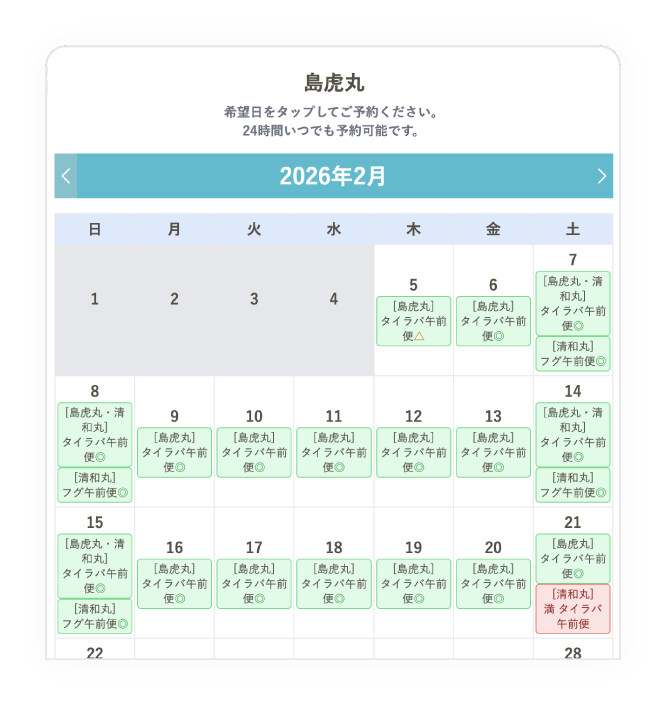 先の予約状況や乗船人数が分かった上で予約でき、乗船名簿も事前に入力できるのが便利です。確認やキャンセルもすべてWEBで完結するので、とても気に入っています。