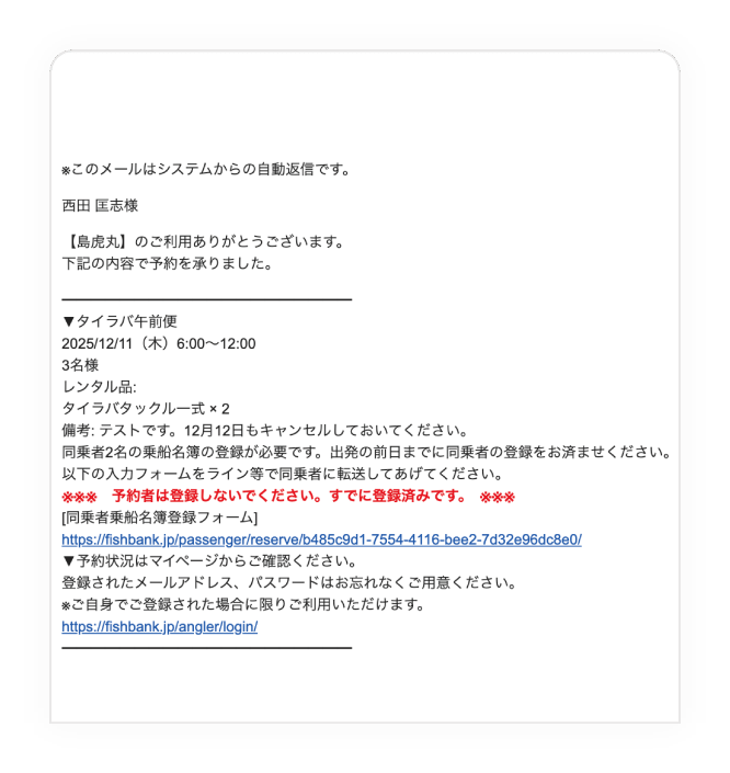 - 船長のメールアドレスに予約内容が通知されます。同時に、船長のマイページに記録されるので、とても便利です。