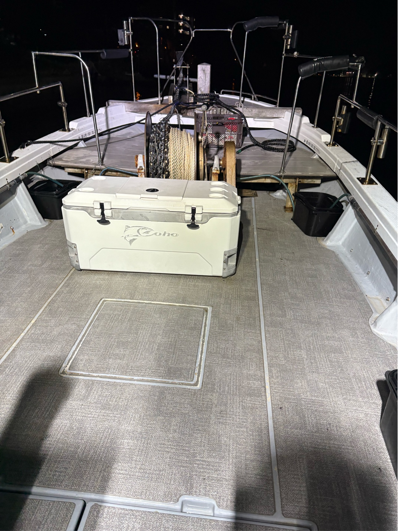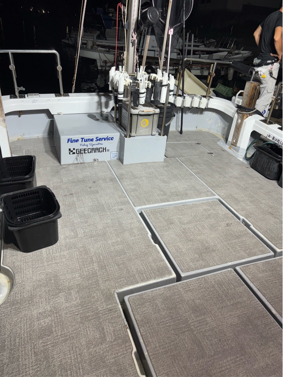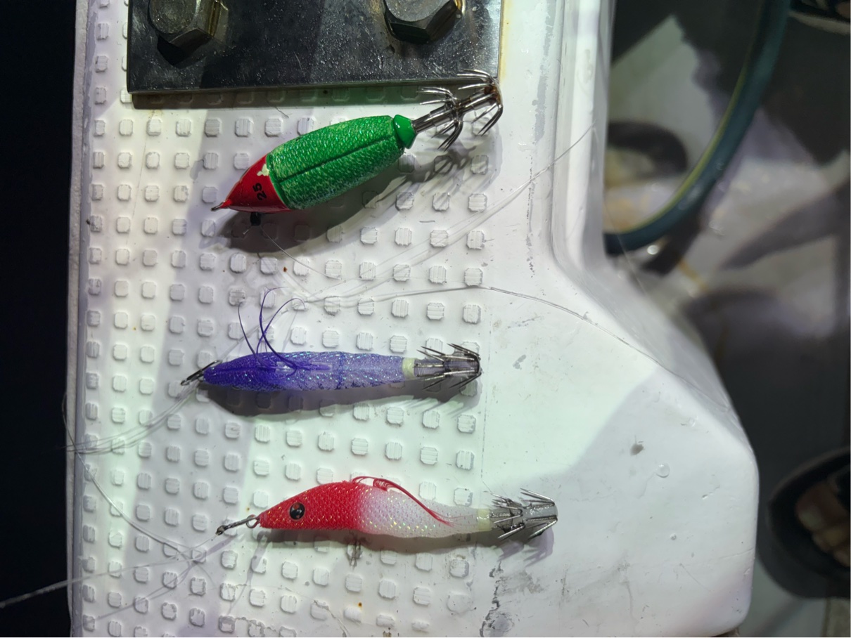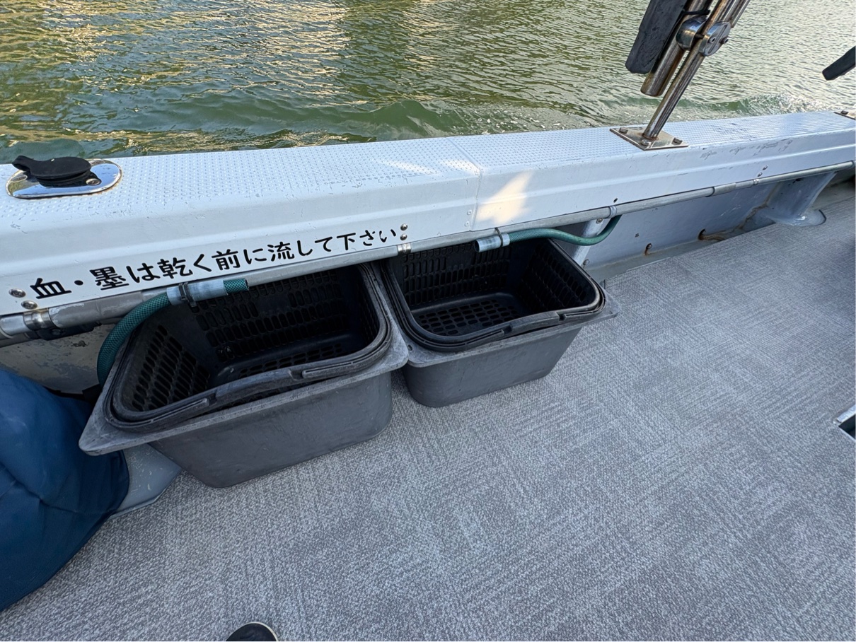 船は設備も多く機能的で快適です。ロッドホルダーも多く手すりにはクッションなどもあります。個人用の生簀ケースもありで底も深いので水量も多く入るのでイカの数を入れておくことができます。