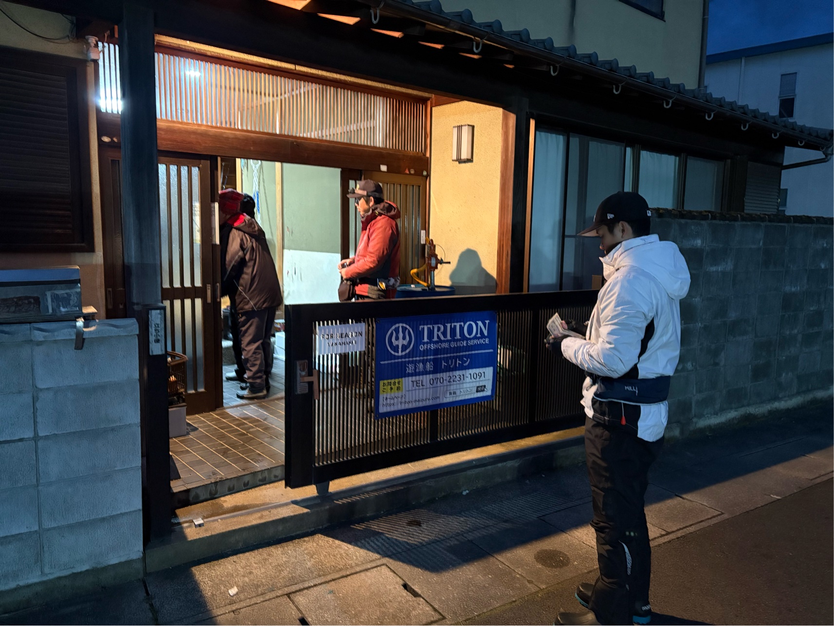 6時15分頃に到着したのですが、船の前には既に車が3台横付けされていますので、これ以上は止められません。専用の駐車場は、船の前の道を挟んで民家があるのですが、そこが船長の自宅との事で、その裏手になります。